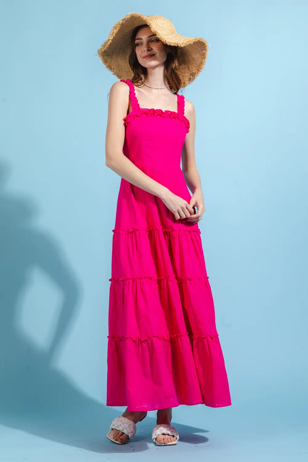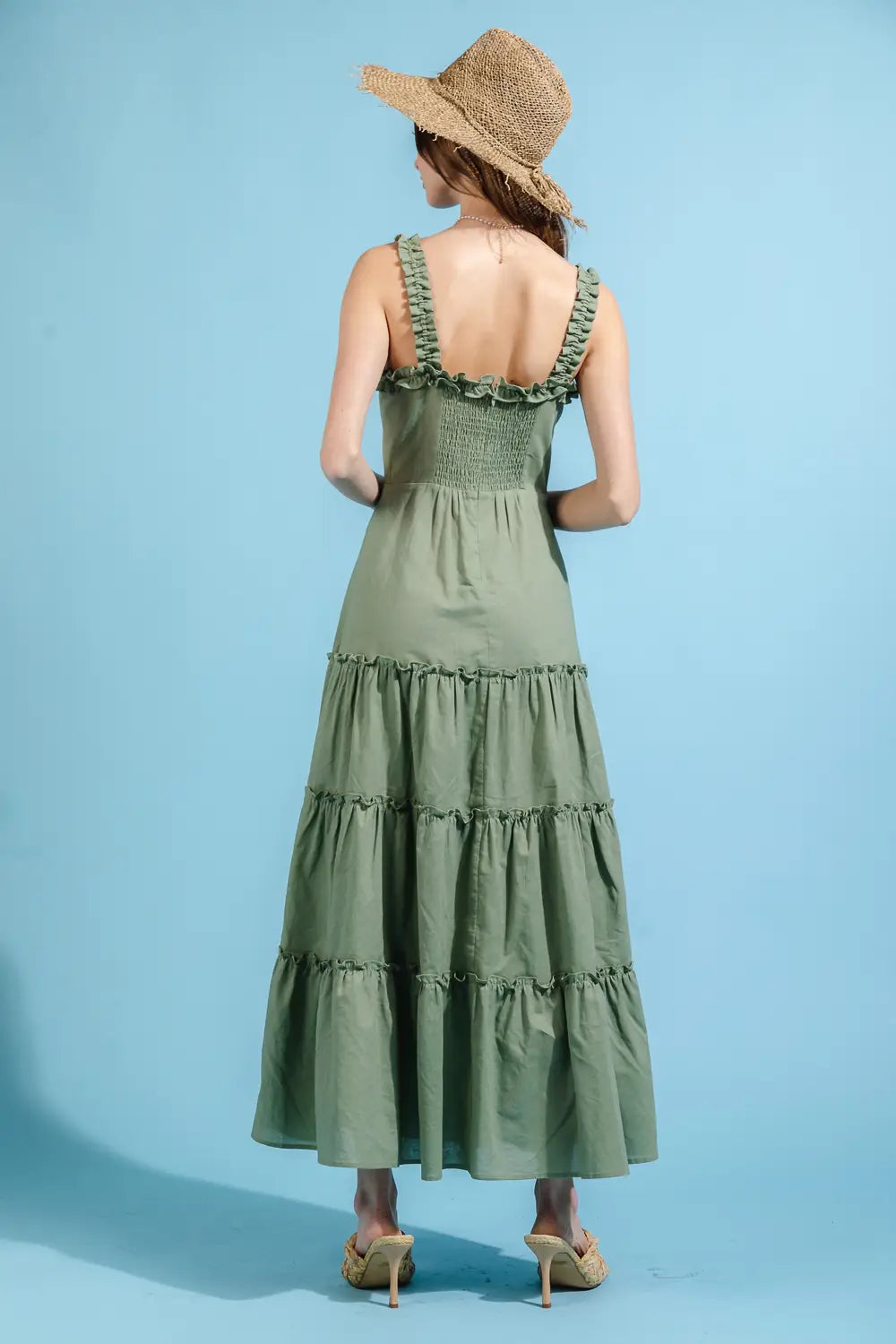 Ruffle detail tiered layers midi dress - Sleeveless - Sqaure neck - Elastic back - Back zipper. 70%Cotton 30%Linen