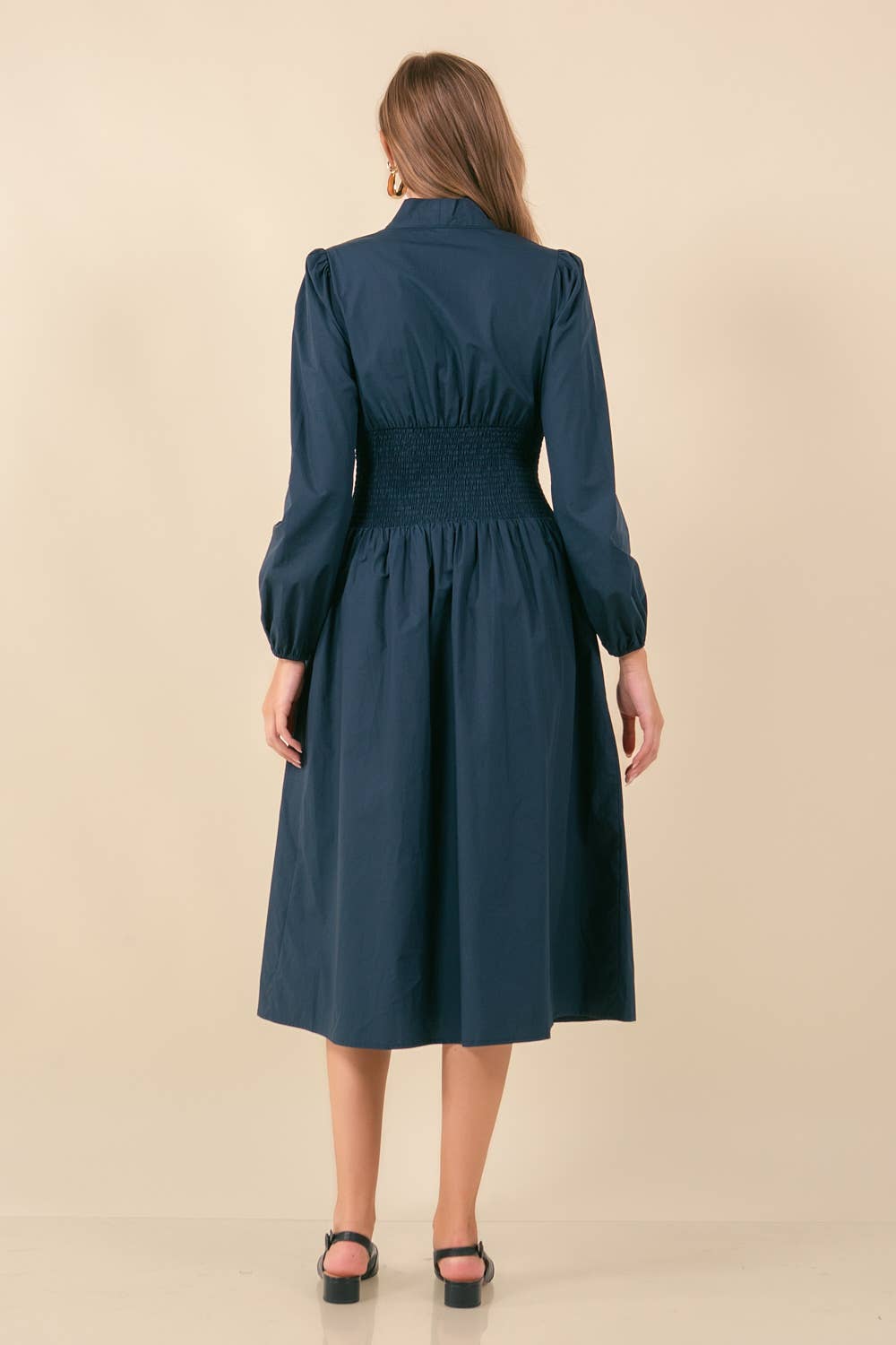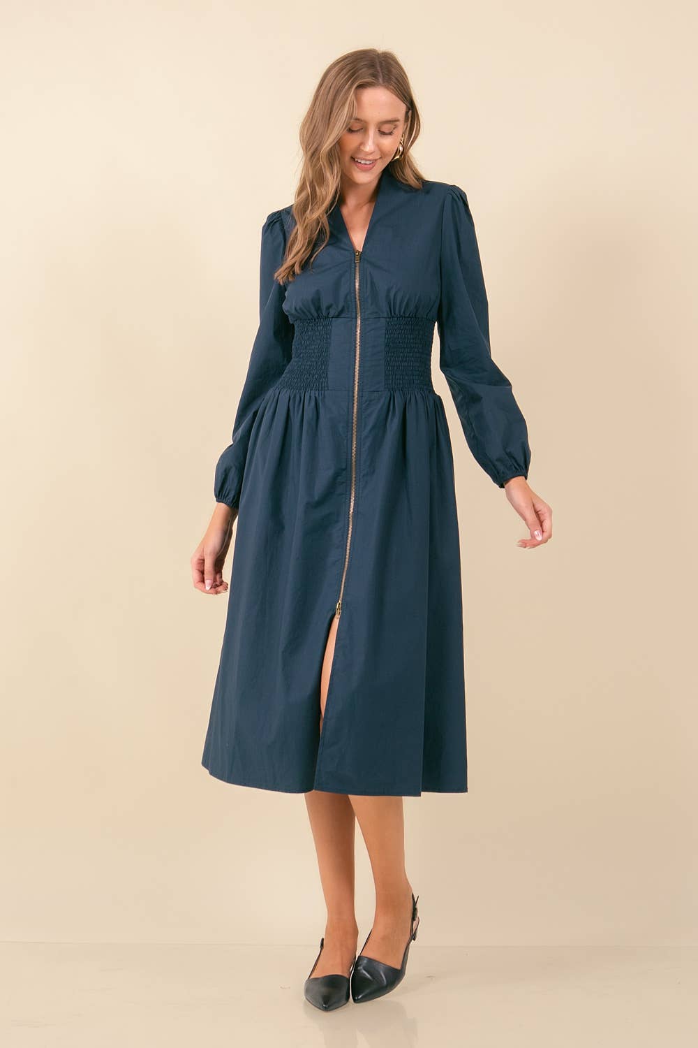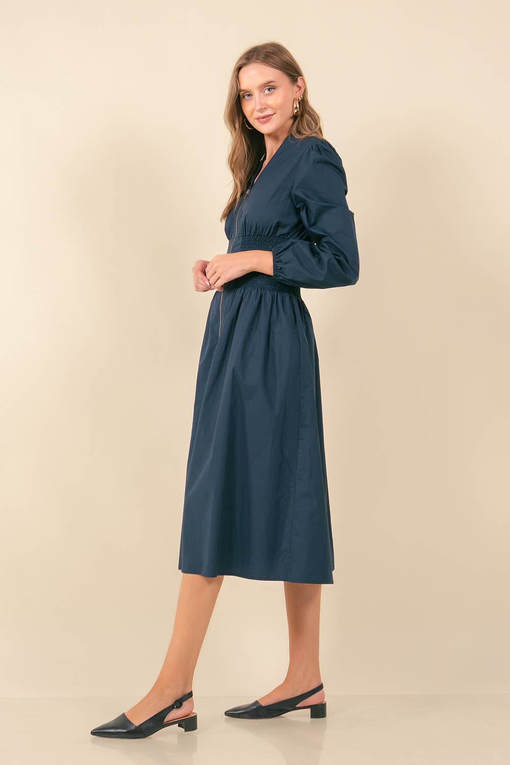 COTTON POPLIN V-NECKING SMOCKED WAIST ZIP- FRONT MIDI DRESS W/ SIDE POCKET & SKIRT LINING