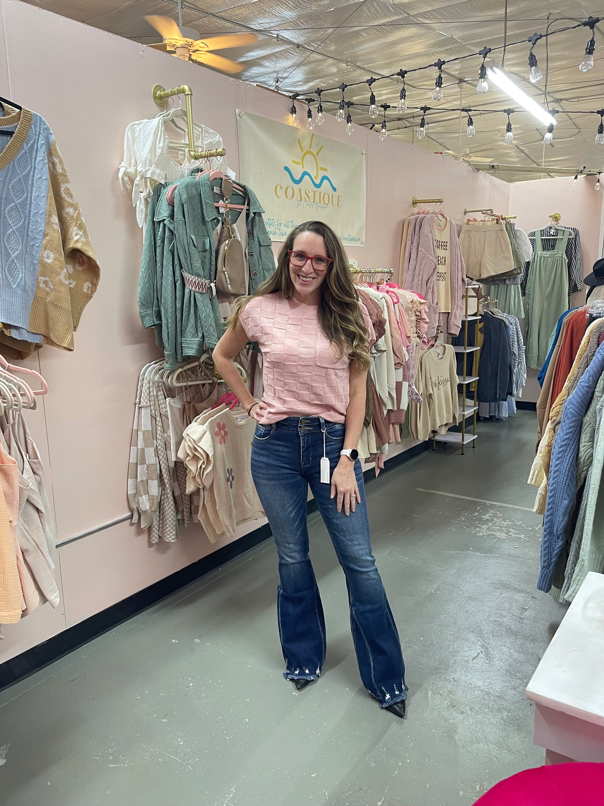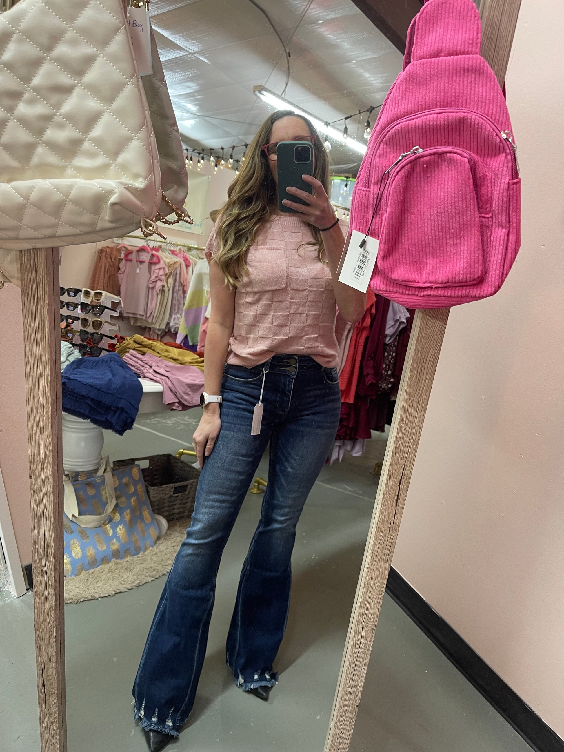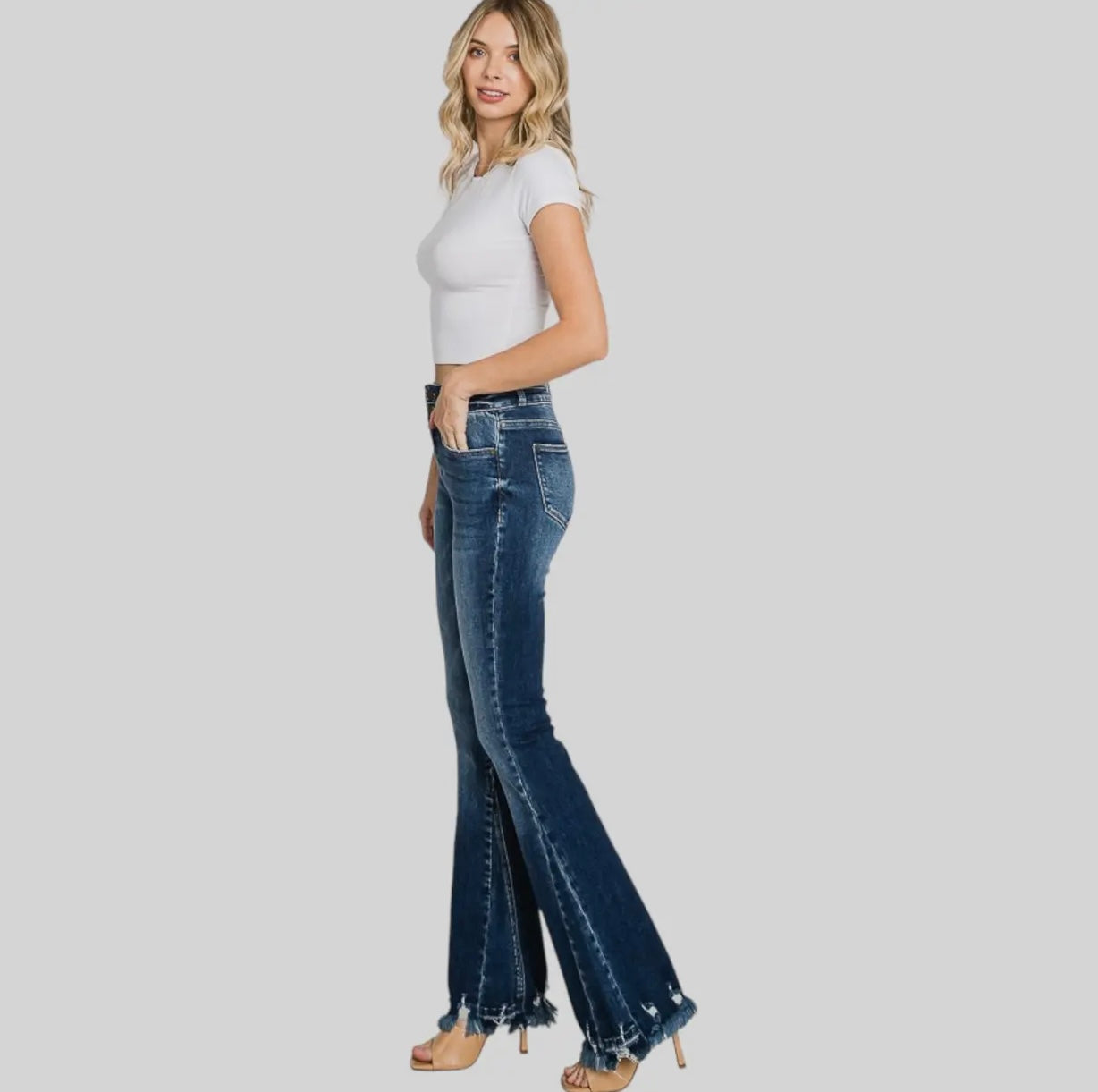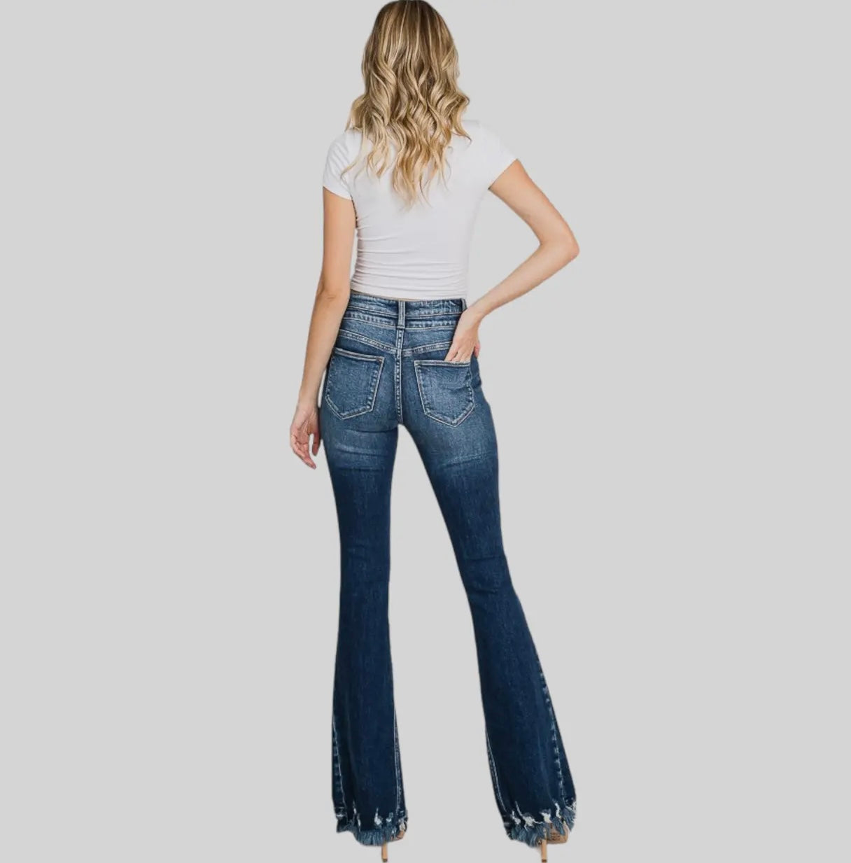 - 10" Rise, 34" Inseam, Modeled in size 5/26 - Leg opening : 22" - High-rise Flare silhouette - Distressed with Frayed hem - Pieced waistband - Button closure and zip fly - 5-pocket styling