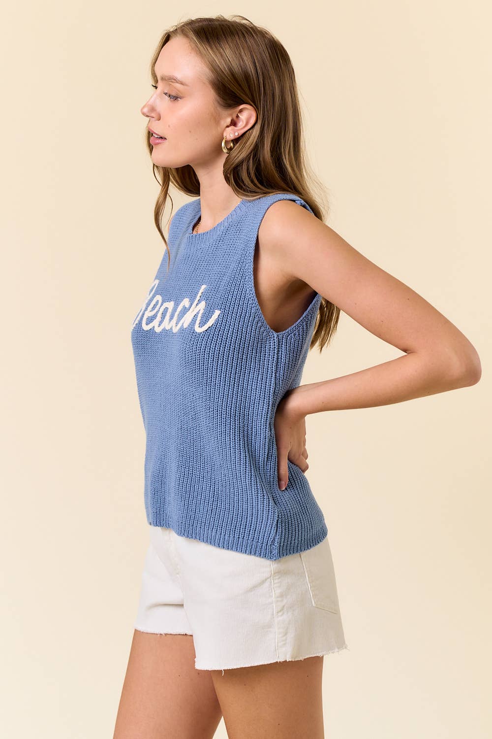 - Sleeveless knit sweater tank top with "Beach" text embroidery